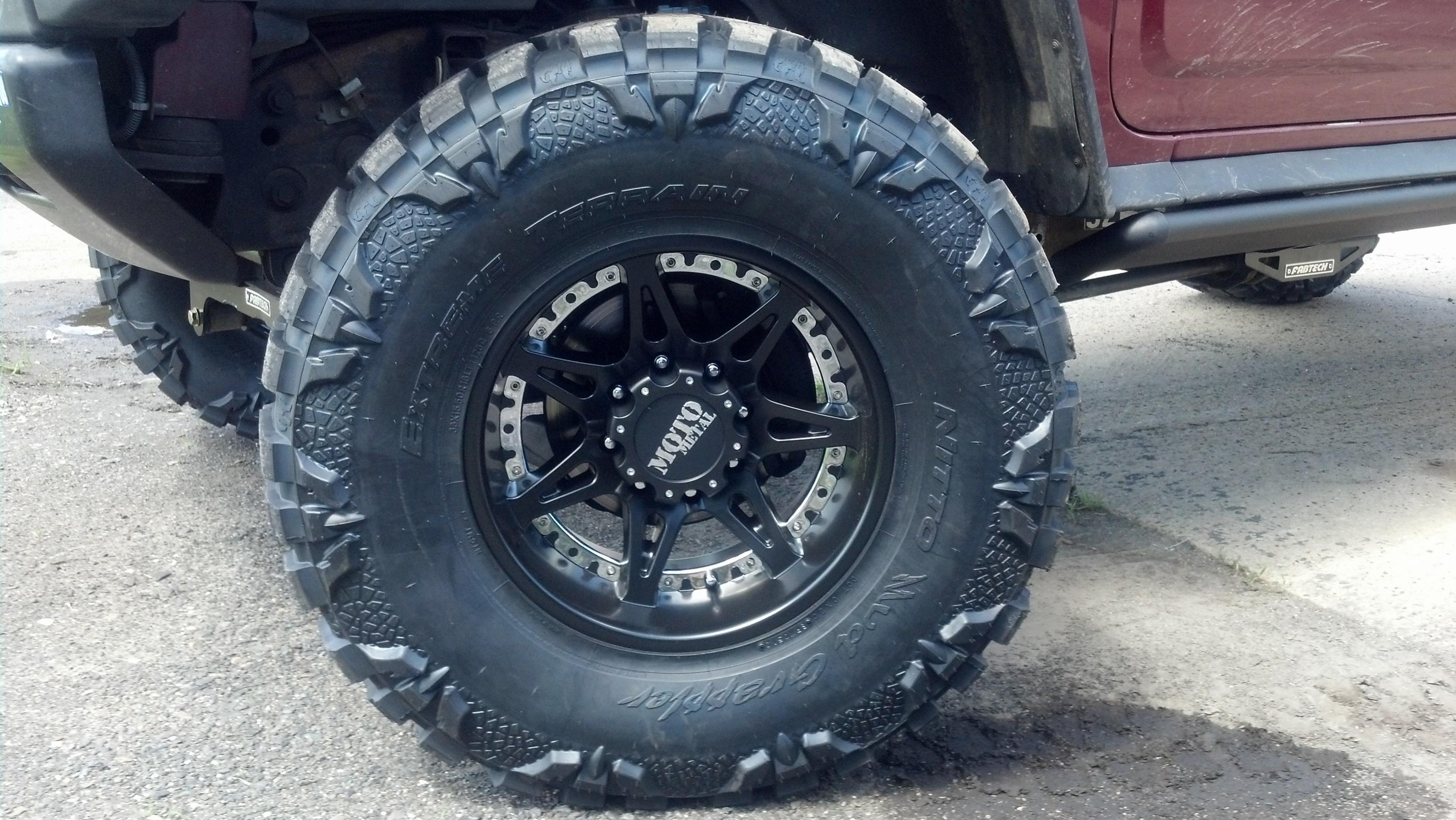 Nitto 38" x 15.50 x 18" Mud Grapplerson 18 x 10" Moto MO961 blacked out. IMG_20130705_151412_024.jpg The tires do not rub around town at all and stick out almost 5" from side of truck which is the look I was looking for. I have NO intentions of adding fender flares or reducing the tires from sticking out. This truck never sees any rocks, mostly water and mud when we are trail riding or at a pit. I removed all the stock running boards and Nerf bars and installed AMP Power Steps IMG_20130711_160913_753.jpg which so far are fantastic for use and looks. IMG_20130706_091637_427.jpg I believe it makes it look taller when retracted and does not take away from the tires aggressive look. Time will tell how they hold up in the mud but I am prepared and willing to deal with that problem if it arises.I have to add an over ride off switch so i do not put them in use when it is buried or swamped. (I forgot :shame:)