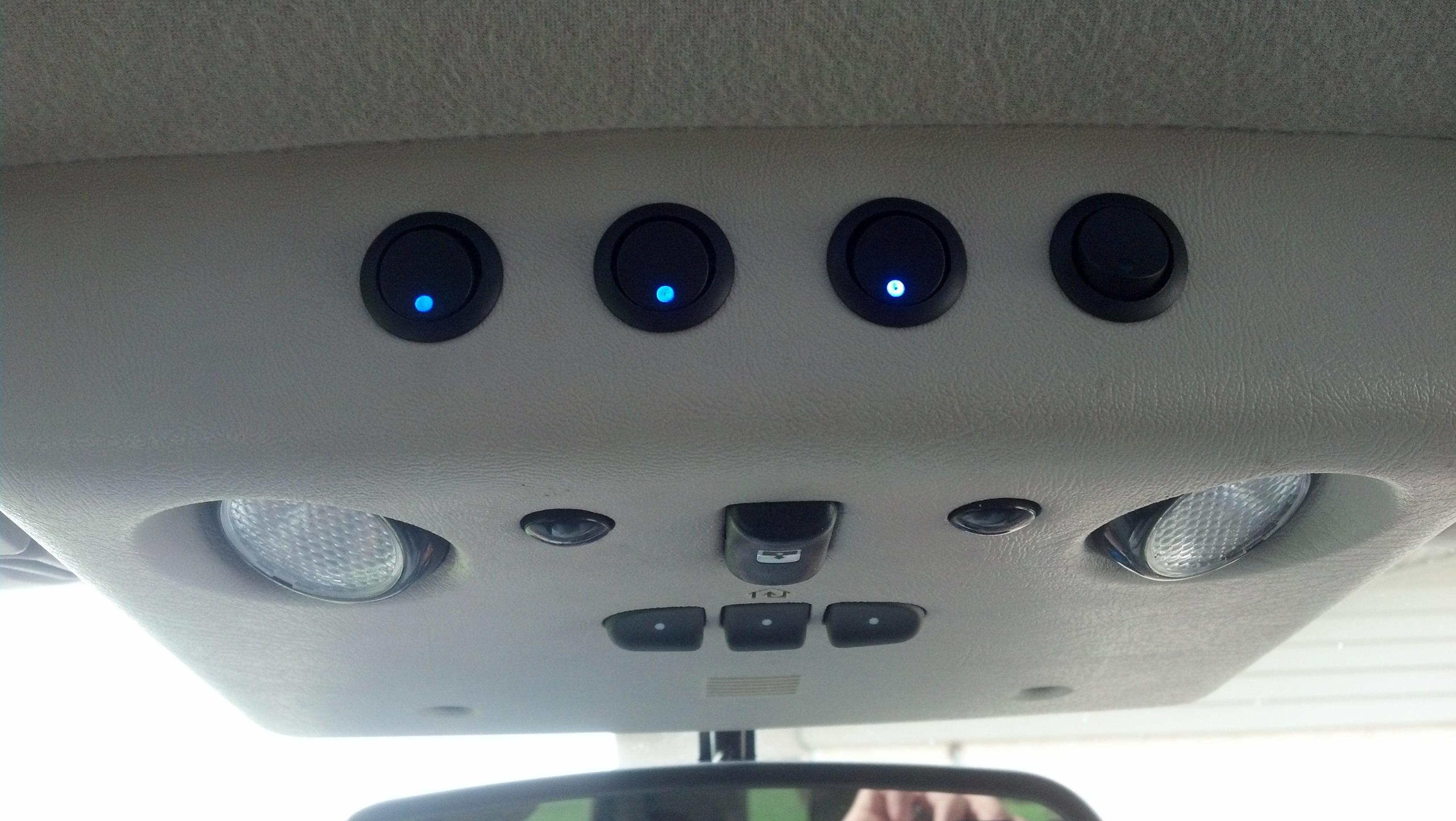 IMG_20130711_154818_518.jpg IMG_20130711_154739_240.jpg A new USB port too for connecting anything else or charging which is a cool feature. I also replaced my original auxiliary light switches which were kinds cheap and flimsy and installed with stickers by the dealer. Since PIAA already had relays built in I did not actual need a big powerful switch and went with 4 lit up bullet rocker switches with lights which I mounted up top IMG_20130711_154711_214.jpgthe center consul which looks like they belong there. I needed three but added an extra for expansion of additional lighting just in case...LOL (might use that as my step disconnect)