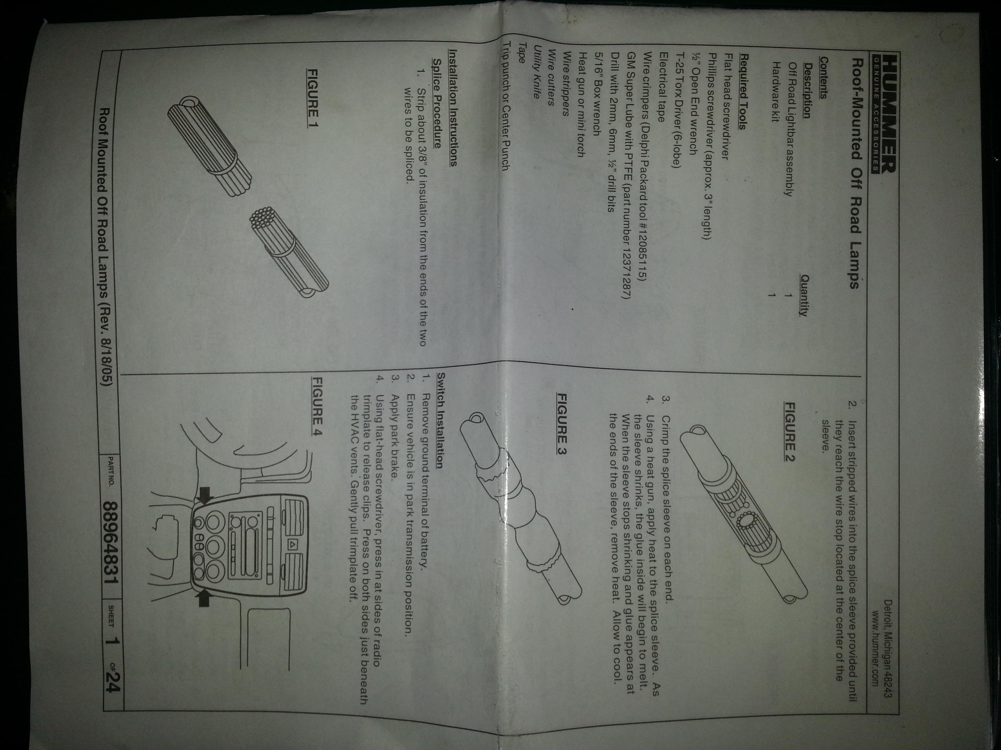 To my dismay, I am selling the roof mounted lights, part number 19171860, minus the wiring harness. I bought these last year with the grill lights and installed the wiring harness, switches, and grill lights. I was just waiting to find the time to finish the roof lights. So this weekend I sent out the ECM and decided to take the down time to install the roof lights. I set the lights up on the roof to eyeball it and my daughter freaked out. She said no way and after a few cold ones I started to agree, once the roof rack is installed I plan on using LEDs anyways.